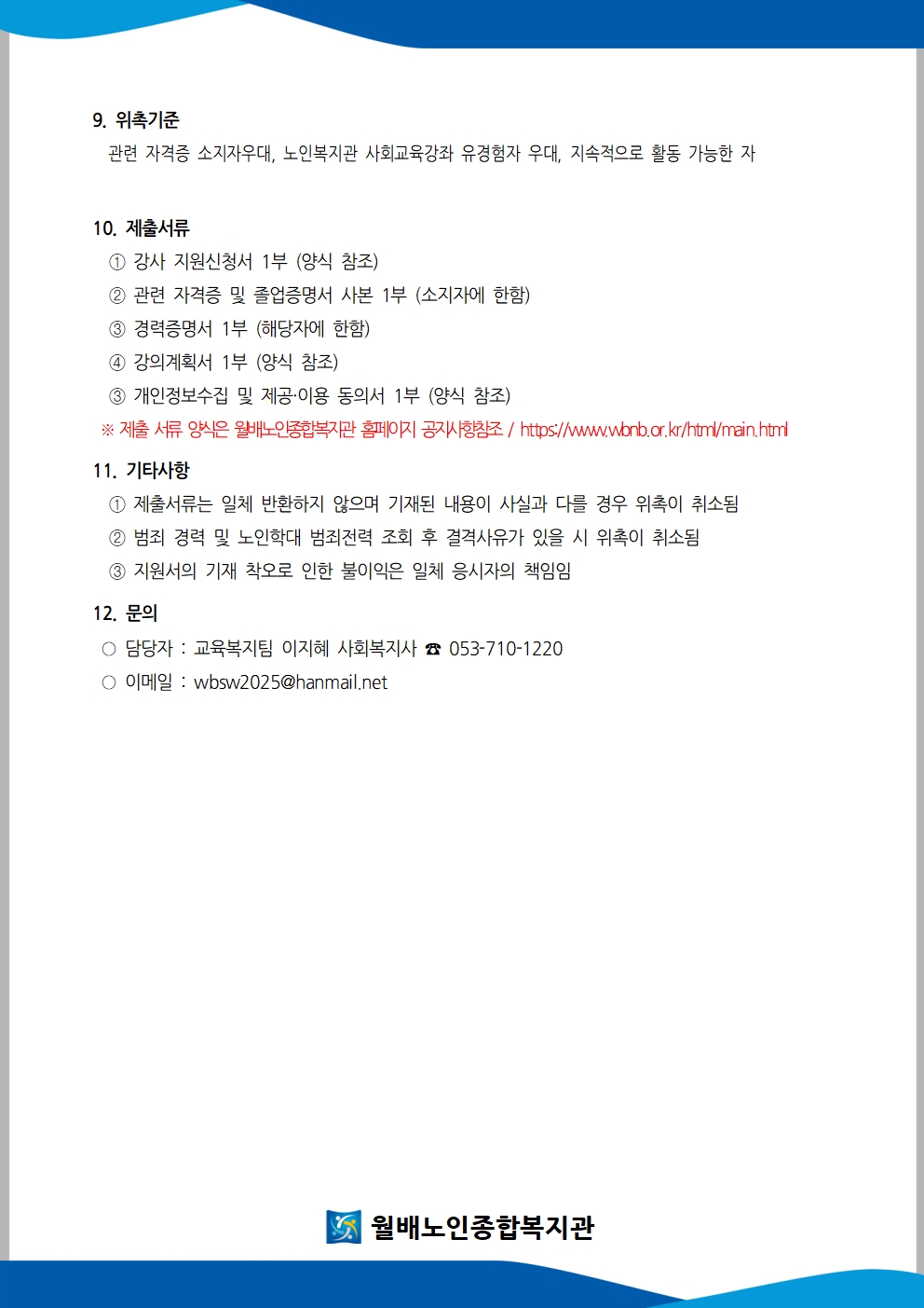 8. 제출서류 ① 강사 지원신청서 1부 (양식 참조) ② 관련 자격증 및 졸업증명서 사본 1부 (소지자에 한함) ③ 경력증명서 1부 (해당자에 한함) ④ 강의계획서 1부 (양식 참조) ③ 개인정보수집 및 제공·이용 동의서 1부 (양식 참조) ※ 제출 서류 양식은 월배노인종합복지관 홈페이지 공지사항참조 / https://www.wbnb.or.kr/html/main.html 9. 기타사항 ① 제출서류는 일체 반환하지 않으며 기재된 내용이 사실과 다를 경우 위촉이 취소됨 ② 범죄 경력 및 노인학대 범죄전력 조회 후 결격사유가 있을 시 위촉이 취소됨 ③ 지원서의 기재 착오로 인한 불이익은 일체 응시자의 책임임 10. 문의 ○ 담당자 : 교육복지팀 이지혜 사회복지사 ☎ 053-710-1220 ○ 이메일 : wbsw2025@hanmail.net