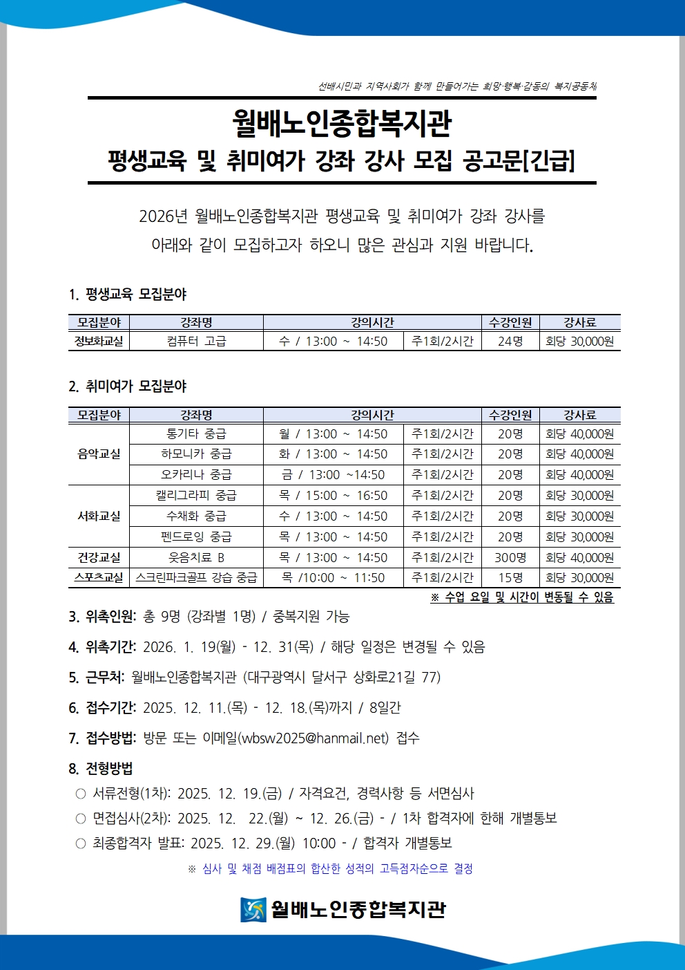 1. 위촉인원: 총 9명 (강좌별 1명) / 중복지원 가능 2. 위촉기간: 2026. 1. 19(월) - 12. 31(목) / 해당 일정은 변경될 수 있음 3. 근무처: 월배노인종합복지관 (대구광역시 달서구 상화로21길 77) 4. 접수기간: 2025. 12. 11.(목) - 12. 18.(목)까지 / 8일간 5. 접수방법: 방문 또는 이메일(wbsw2025@hanmail.net) 접수 6. 전형방법 ○ 서류전형(1차): 2025. 12. 19.(금) / 자격요건, 경력사항 등 서면심사 ○ 면접심사(2차): 2025. 12. 22.(월) ~ 12. 26.(금) - / 1차 합격자에 한해 개별통보 ○ 최종합격자 발표: 2025. 12. 29.(월) 10:00 - / 합격자 개별통보 ※ 심사 및 채점 배점표의 합산한 성적의 고득점자순으로 결정 7. 위촉기준 관련 자격증 소지자우대, 노인복지관 사회교육강좌 유경험자 우대, 지속적으로 활동 가능한 자